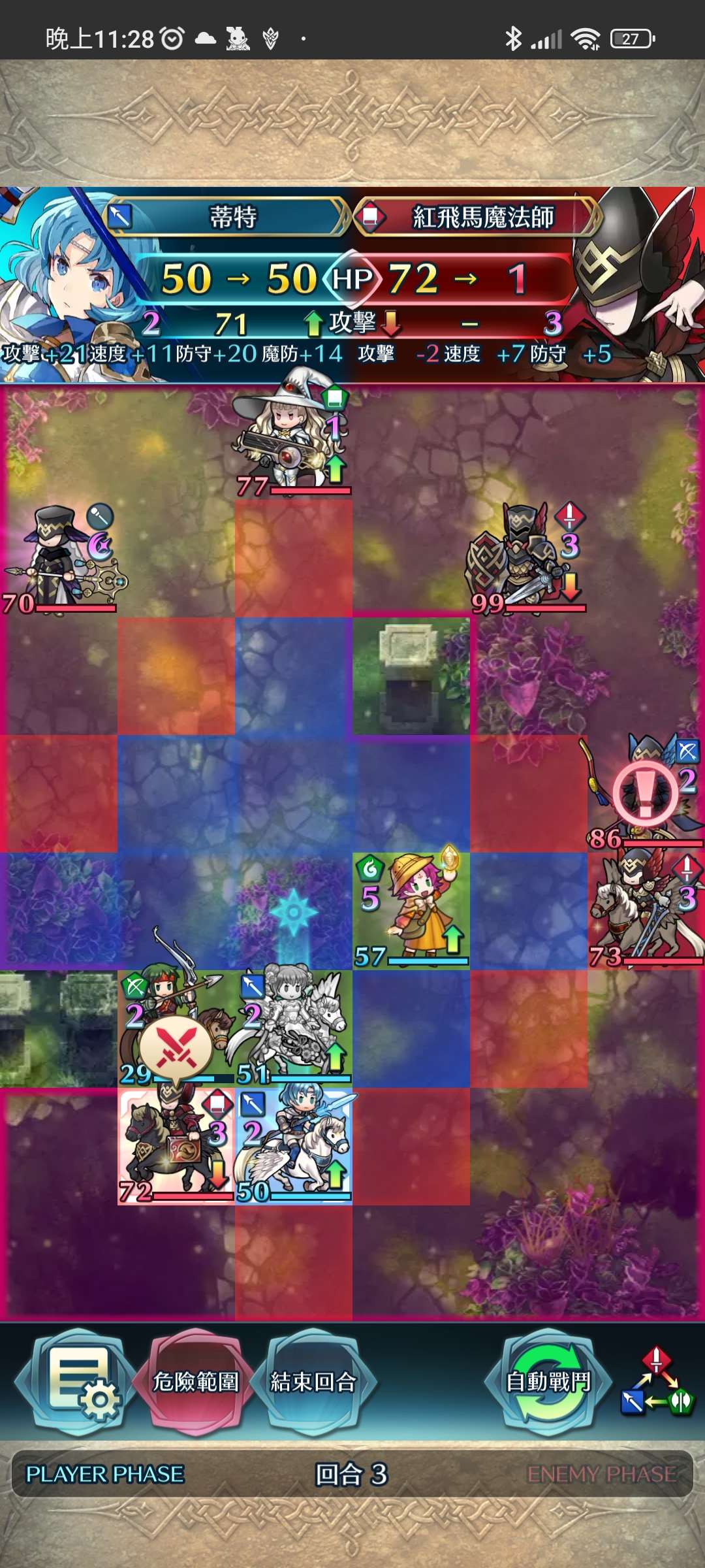 第一回合,將蒂特推上前線,敵回合蒂特靠上乘體質及遠反聖印,擋下飛槍攻擊後,連環反殺斧騎與紅藍兩法師。