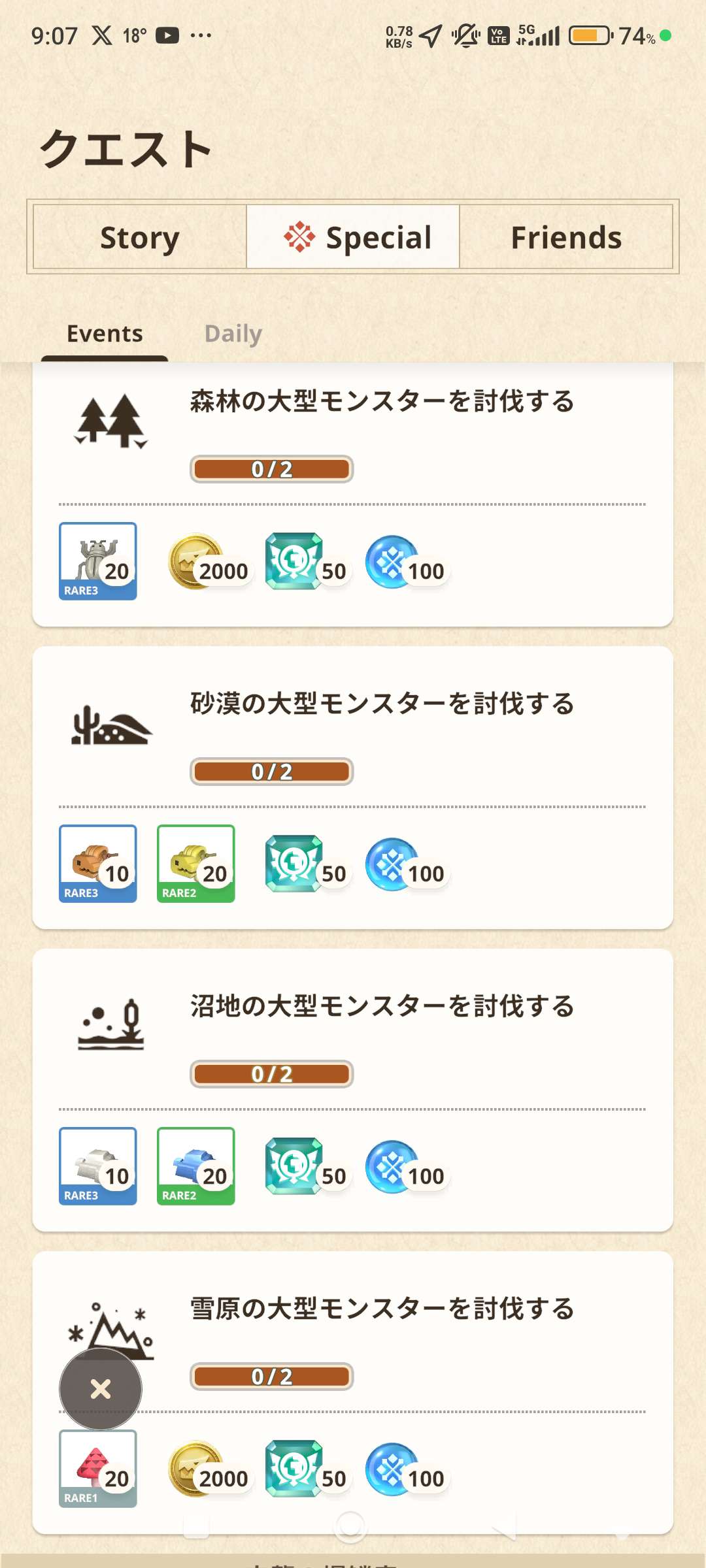 討伐森林/沙漠/沼澤/雪原的大型魔物各2隻