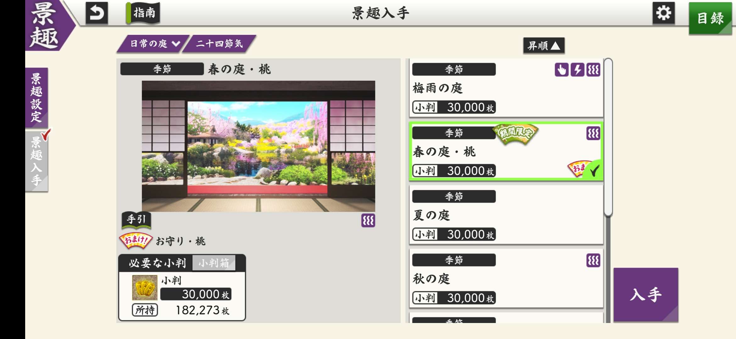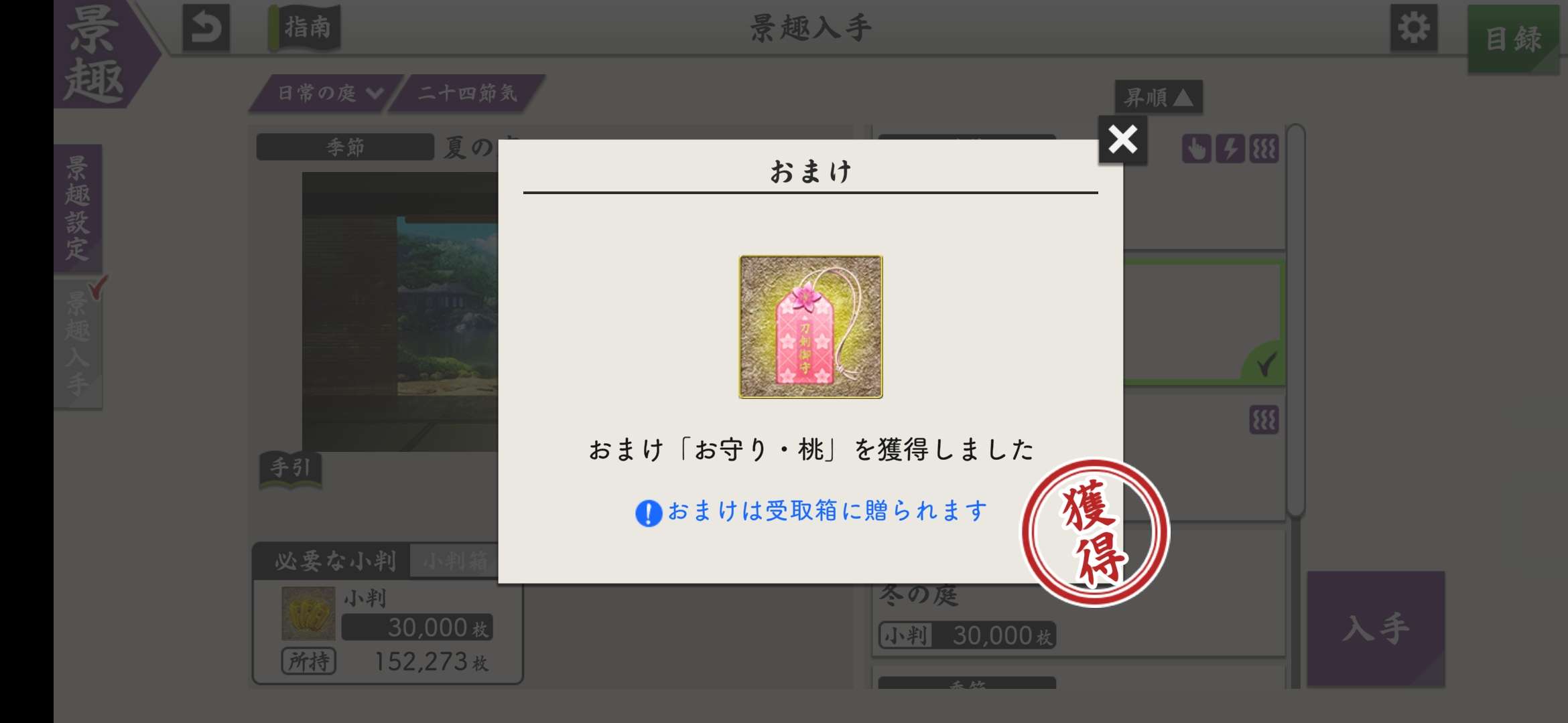 使用3萬小判,購買景趣【春の庭・桃】可以獲得一個特殊御守『お守り・桃』(購買後請到受取箱領取出來)