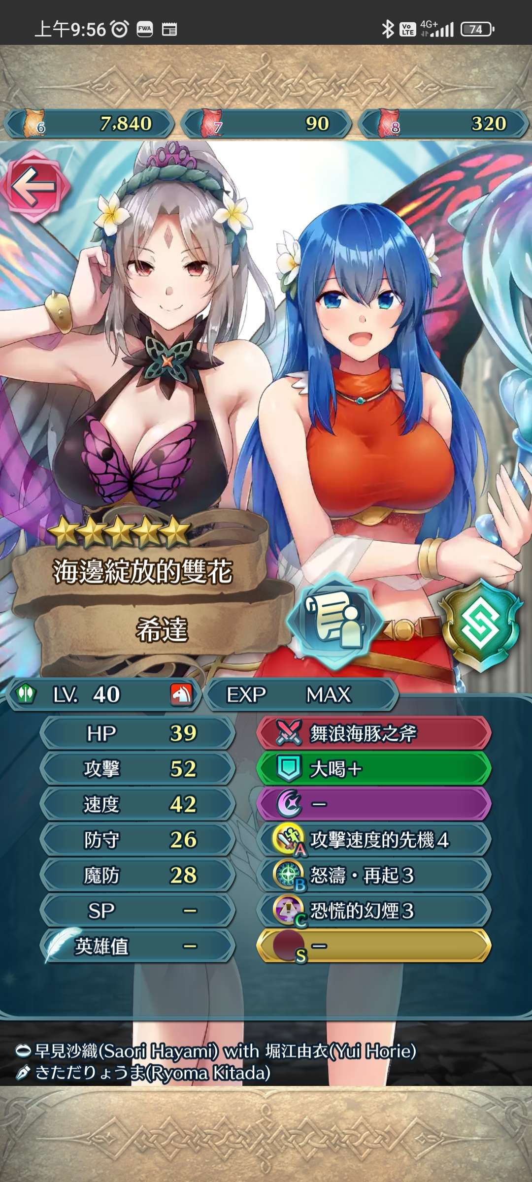 希達與普露梅莉亞-斧騎,雙界英雄。當初登場時已經感到兩位角色完全風馬牛不相及,而且圖面甚有小黃遊氣息(或許是優點)。她們的價值在於雙界模式有加成。技能承繼一些增強正手攻擊的。因為專用武器已經附有再移動,B技能選擇抑制敵方奧義更佳。