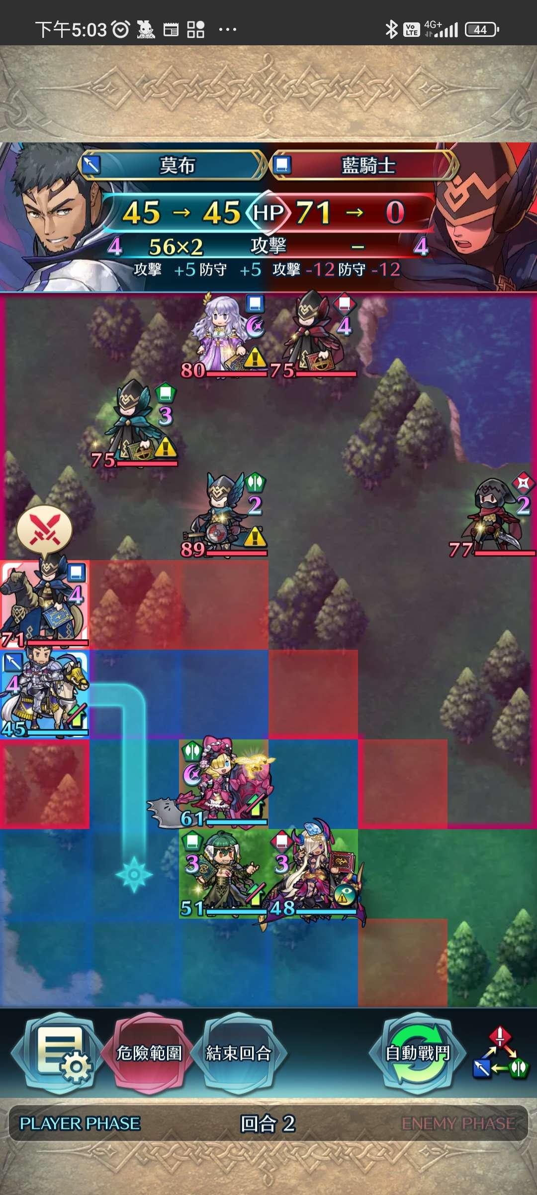 第二回合,莫布殺左路藍騎法。瑪倫向上一步,其餘跟上。敵回合,瑪倫反殺步斧後,硬接聖女攻擊。