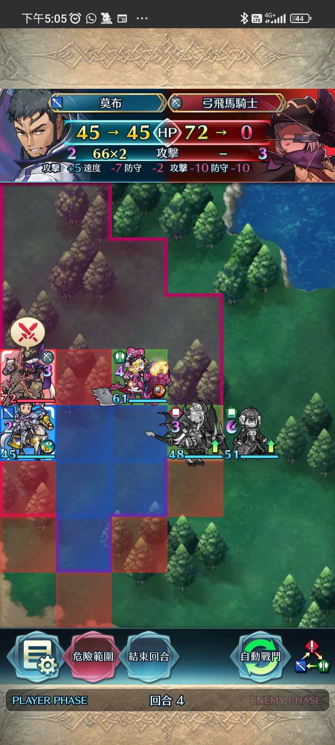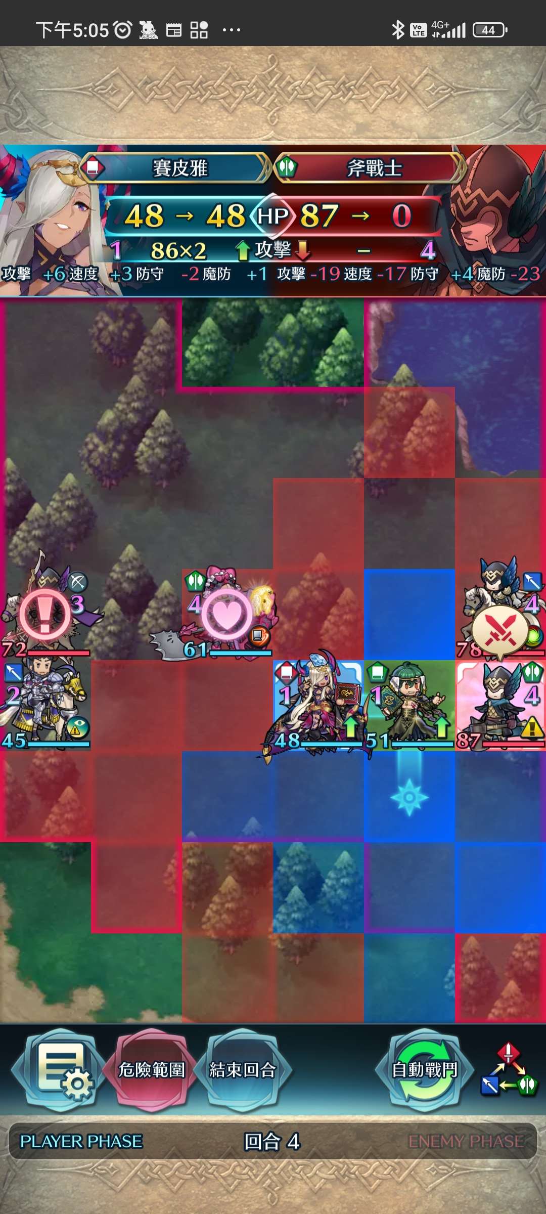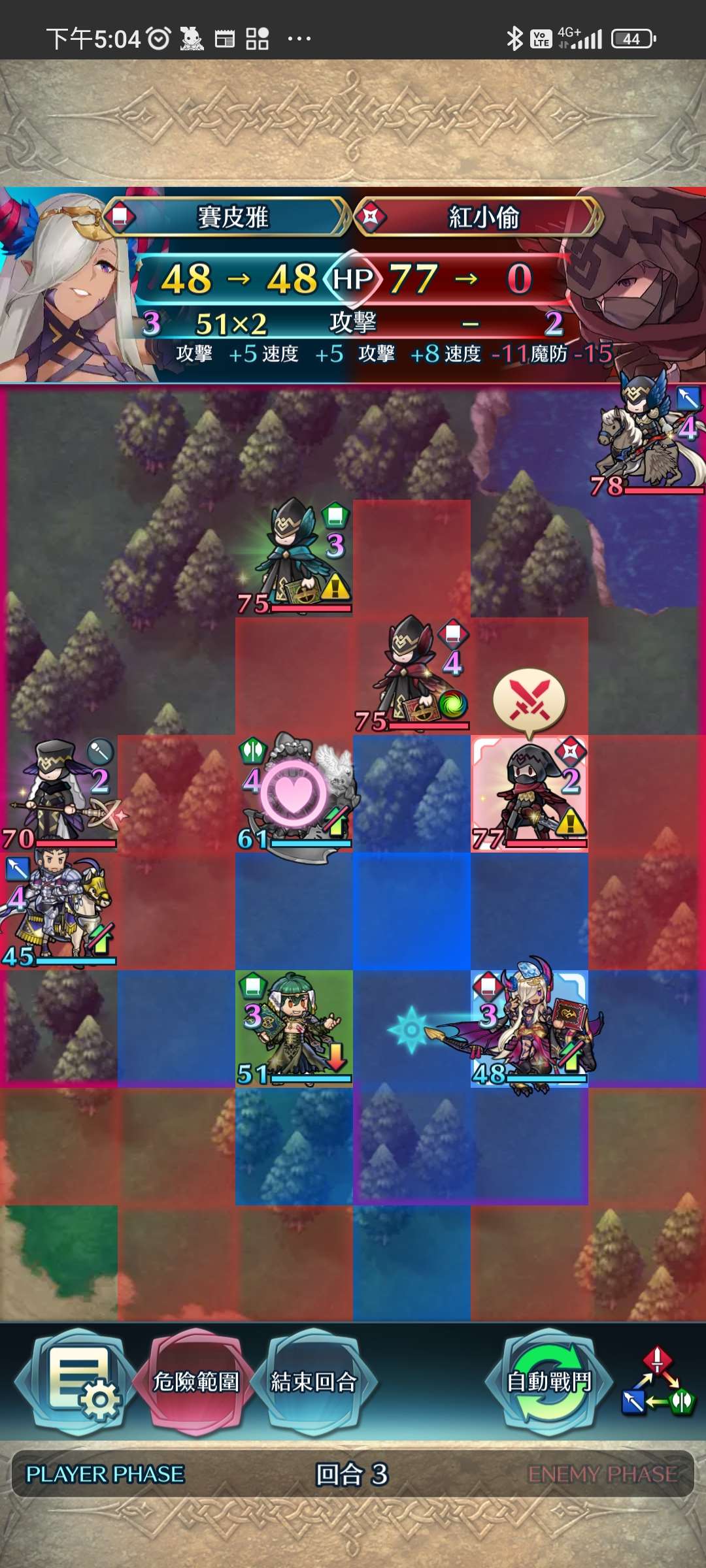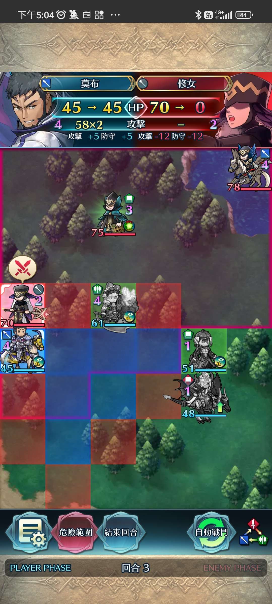 第四回合,賽皮雅殺步斧,孤慄殺飛槍,莫布殺飛弓。敵全滅,完。
