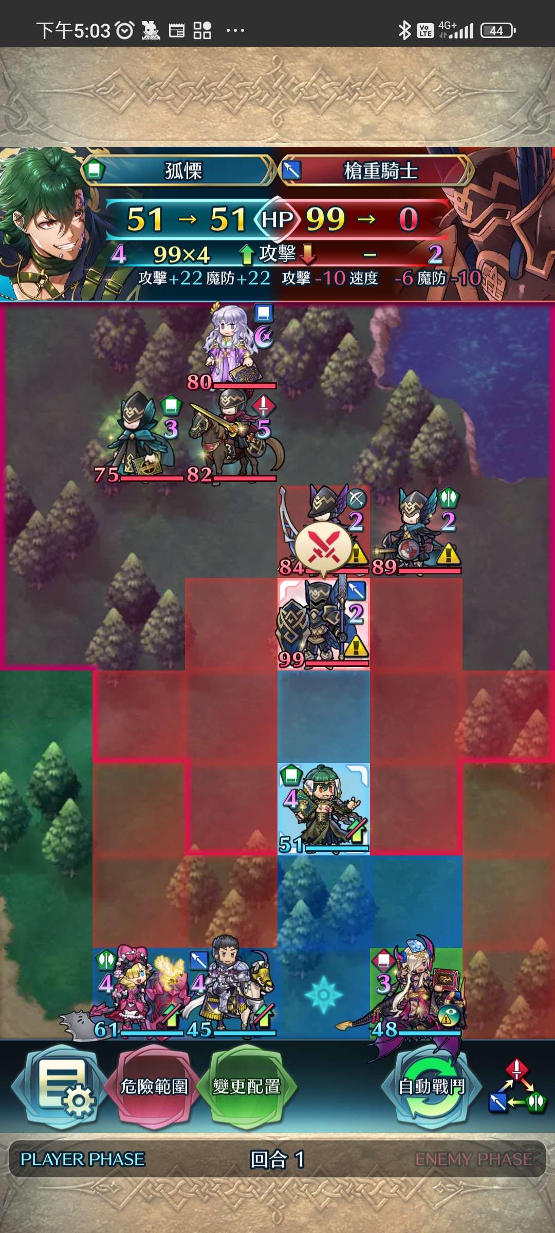 第一回合,孤慄先殺遠護重槍後返回。莫布帶出瑪倫,賽皮雅跟大隊。敵回合,瑪倫連環反殺劍騎與步弓。