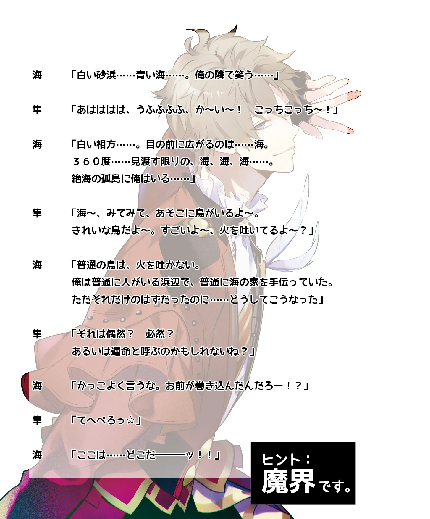 海「白色的對象……。在眼前的…只有廣闊的海洋。360度……不管怎麼看都是海、海、海……。現在我所身處的是絕世的孤島……」