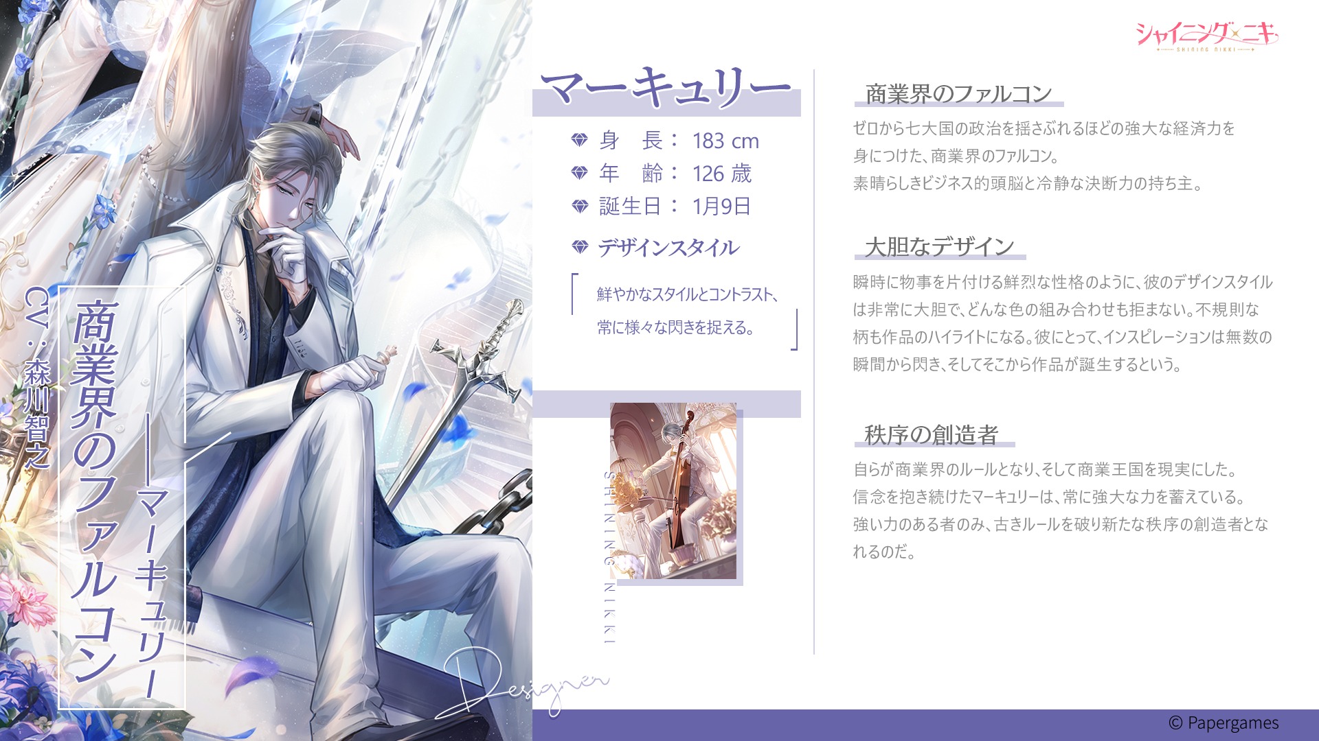 擔當第3彈閃耀設計師介紹的是世界級財團企業·墨丘利財團的創辦人兼總裁——墨丘利(CV:森川智之)。