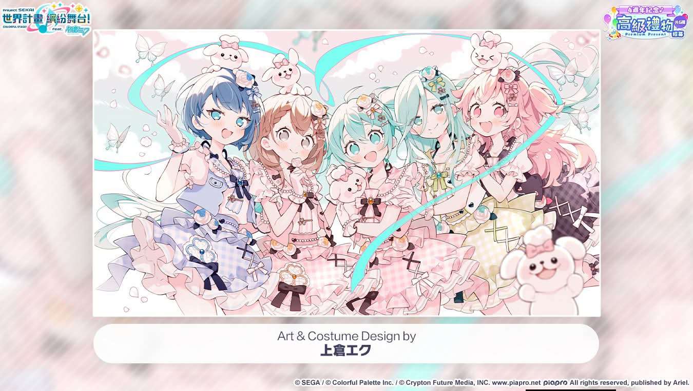 「世界」ver.:初音未來(Original CV by 藤田 咲)、花里實乃理(CV. 小倉 唯)、桐谷遙(CV. 吉岡 茉祐)、桃井愛莉(CV. 降幡 愛)、日野森雫(CV. 本泉 莉奈)