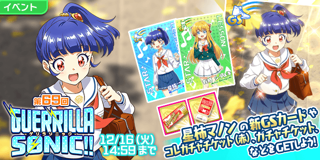 12月9日17:30开始,将举办积分类活动GUERRILLA-SONIC!!,累积达到一定分数,就可以获得GS等级的「星柿マノン」一张,同时抽选获得其与「有栖白雪」的训练卡,可将GS卡牌提升到接近P卡水准的GS+等级。