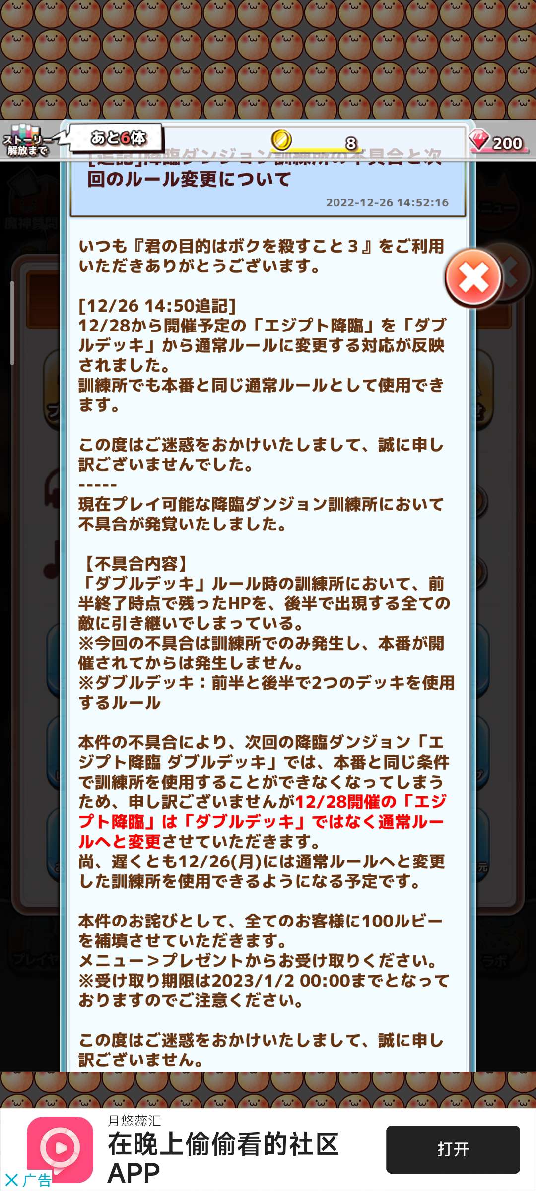 12/30举办的「埃及神降临」的排行榜显示不了玩家,将在下次1/5举办的降临地牢「二攻击型降临」结束之前修正并正常显示。