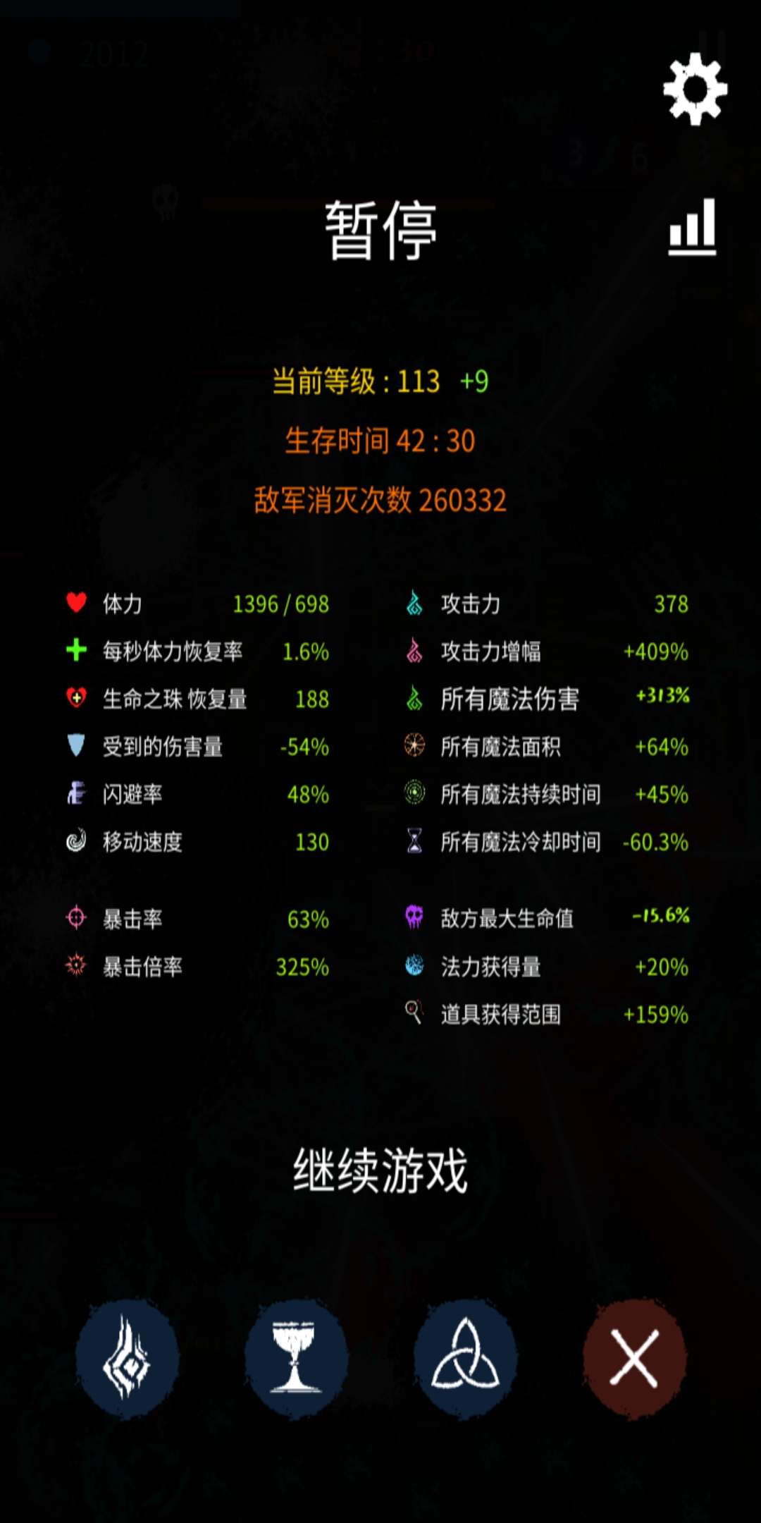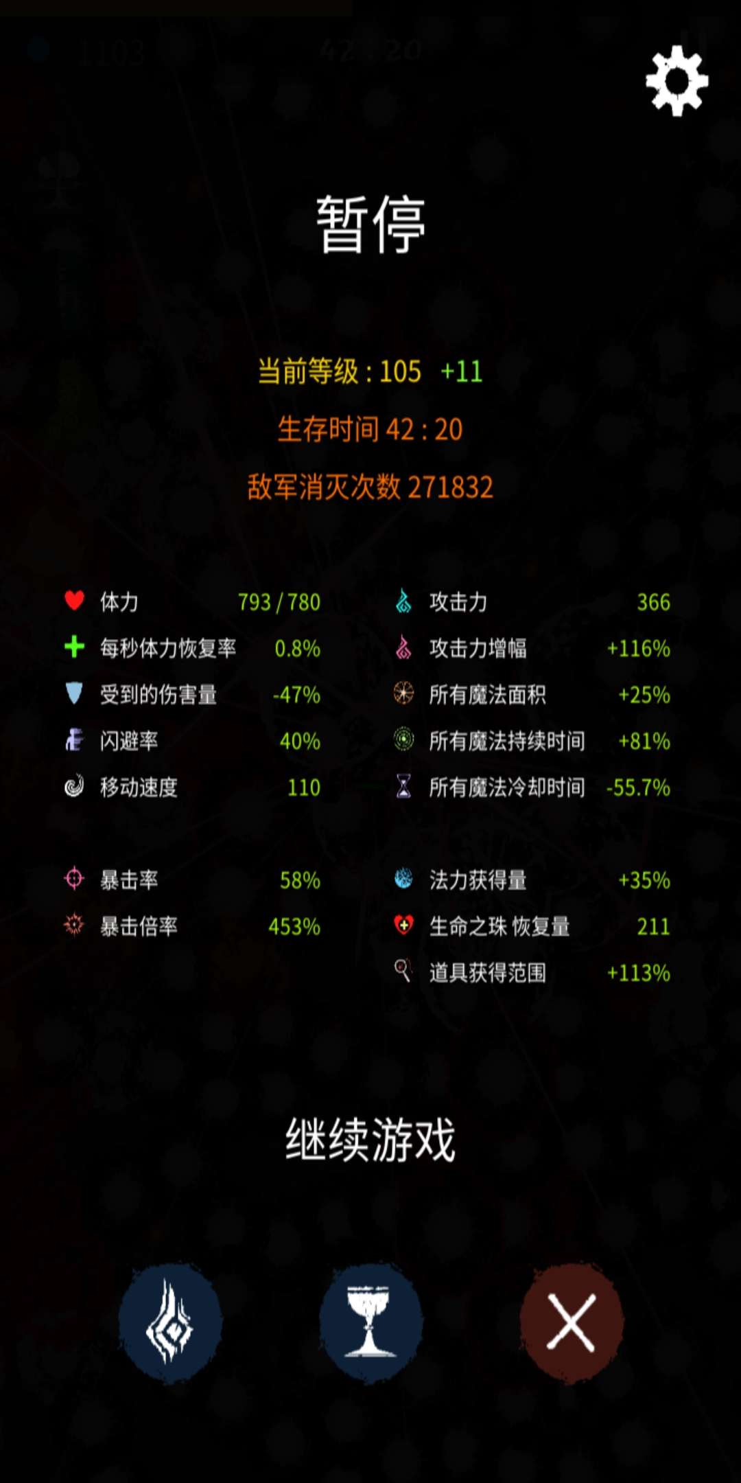 游戏目前想要推到后面时间(40分钟)的主要流派只有一种,适配组合魔法(爆能枪,以气御剑之类的)+主宰+机械降神。这个流派可以通过获取其他主动魔法(魔力蛋之类的可以主动释放的魔法)来增强第一个组合魔法的冷却攻击属性,然后只需要围绕你选择的组合魔法选择需要的神器。需要注意的点有两个非常重要,敌人最大生命值降低率,怪数值随时间提升倍率还是比较可怕的,所以降低敌人最大生命值相当于变相把当下敌人的属性往前推,也就是45分打42分左右属性的怪。这也算变相的逃课小技巧( 另一个暴击倍率,重要的事情说三遍,暴击倍率非常重要,暴击倍率非常重要,暴击倍率非常重要!!!因为后期数值倍率摆在那里,提升的倍率所实现的属性收益是越来越低的,所以想要再次提升数值只能通过暴击倍率来切入,由于攻击力和暴击倍率得出的结果是乘积,当攻击力收益越来越低,提升另一个的收益反而能够达到意想不到的效果。