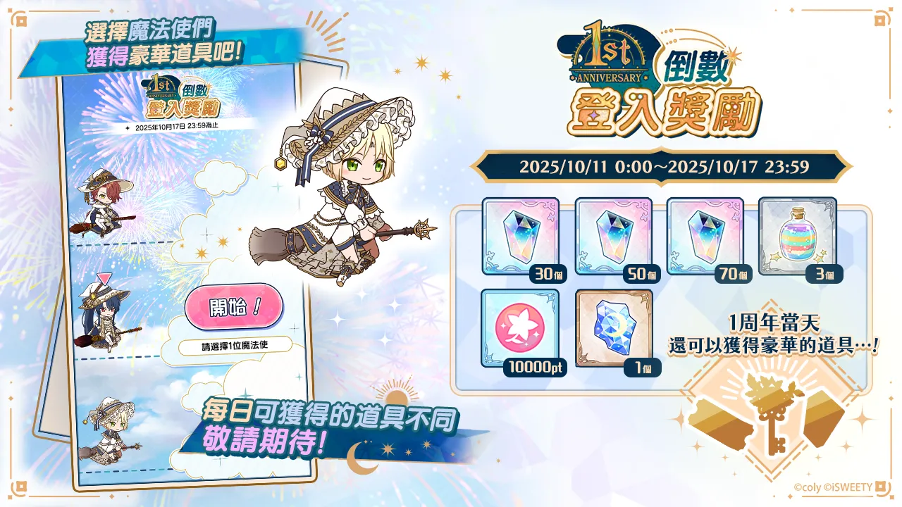 1st Anniversary倒數登入獎勵10月11日 00:00起,於主頁畫面選擇一位您喜愛的【正裝的魔法使】將可以獲得豪華獎勵!